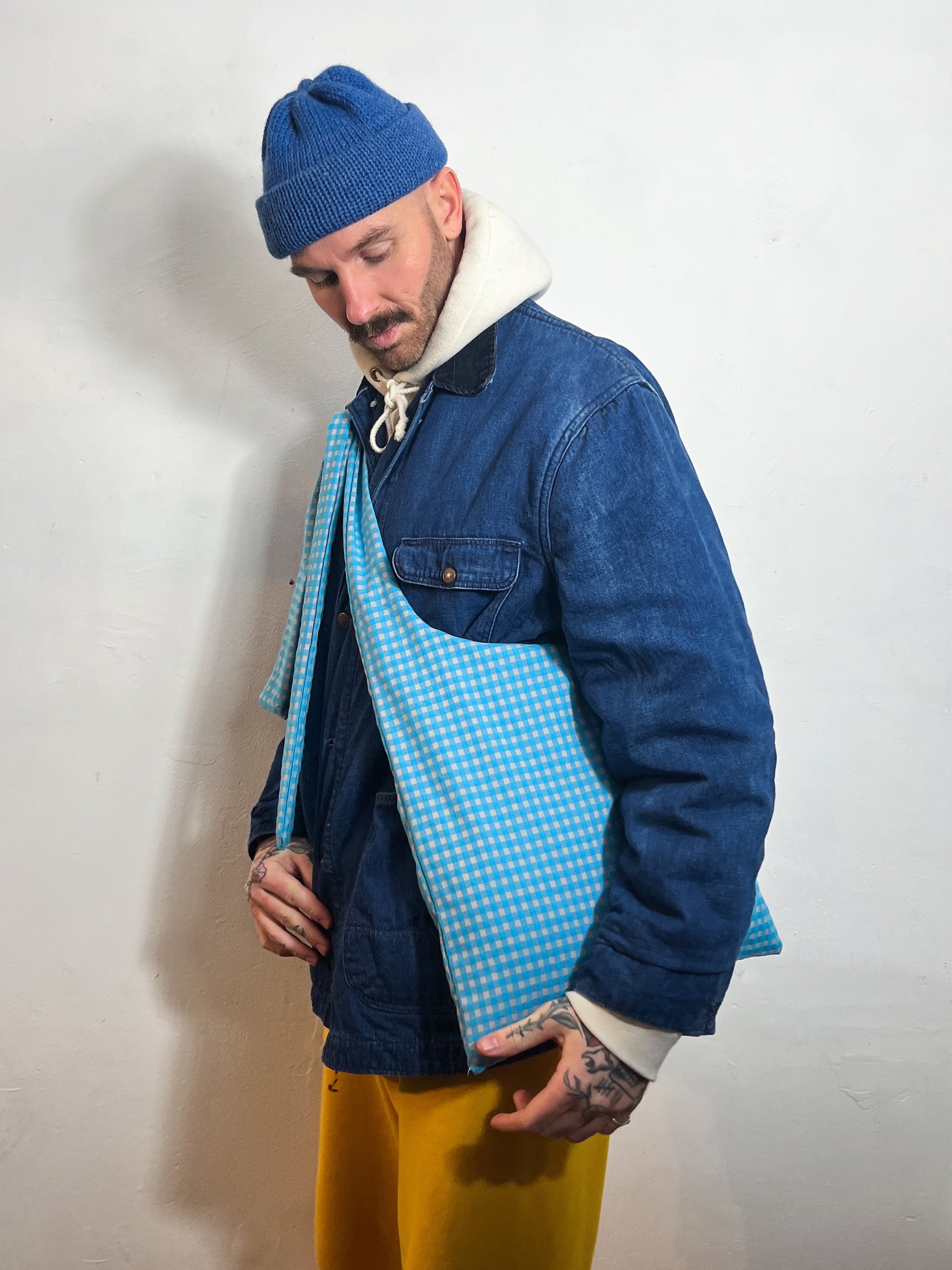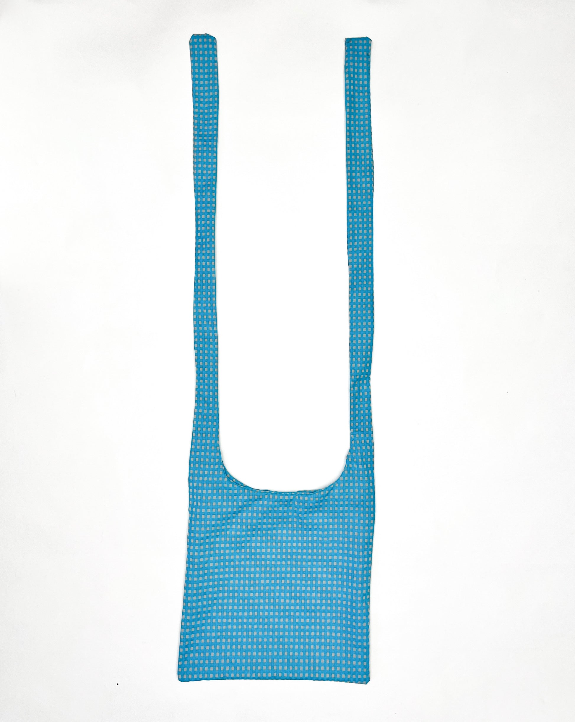 Unisex Ao Gingham Cross Body Sling Bag with Adjustable Straps in End-of-Roll Deadstock in a beautiful grey and blue gingham Cotton