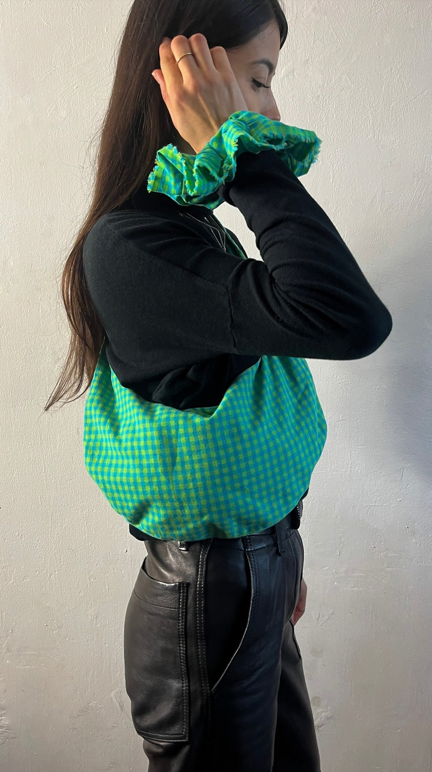 Tākoizu Gingham Sling Cross Bag with Adjustable Straps made with 100% soft turquoise green cotton